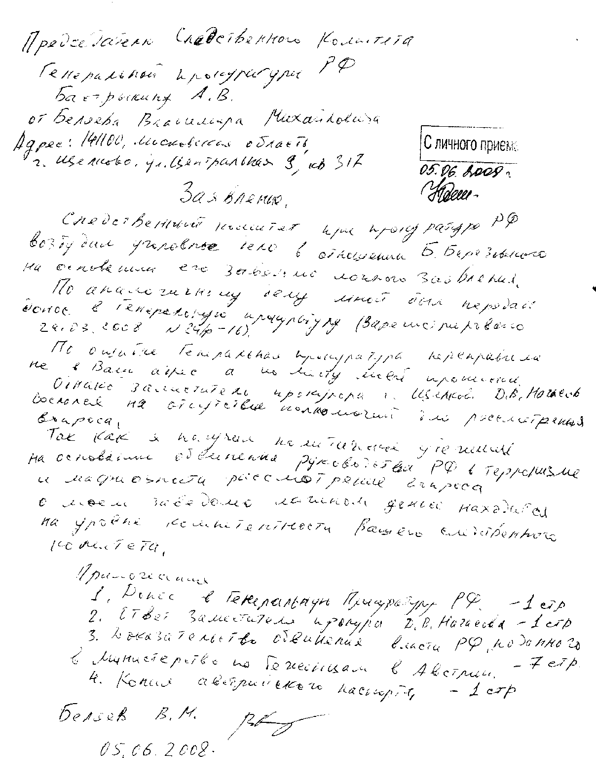 Следственный комитет при прокуратуре РФ (СКП) возбудил еще одно уголовное дело в отношении Бориса Березовского на основании заведомо ложного заявления Березовского о подготовке российскими спецслужбами его убийства. Однако большой надежды на реальное решение данного пожелания у Генеральной Прокуратуры вероятно пока нет. Поэтому для повышения доверия и рейтинга Прокуратуры и спецслужб России предлагаю провести для начала показательную акцию по аналогичной ситуации по отношению ко мне, Беляеву Владимиру Михайловичу находящегося к Вам территориально гораздо ближе, в пределах московской области. |