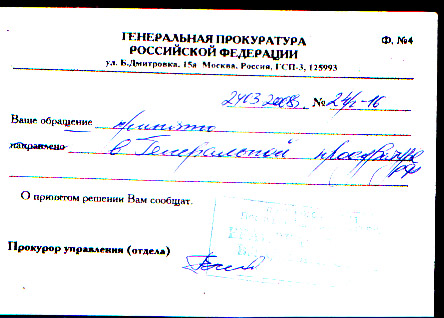 ![]() Заявление из Генпрокуратуры пустили в Московскую Областную прокуратуру, а потом в Щелковскую. Беляеву В.М. №764ж-06 от 02.04.08 Сообщаю, что Ваше обращение, в котором изложены просьба о возбуждении в отношении Вас уголовного дела за заведомо ложный донос, соединенный с искусственным созданием доказательств по ч.З ст. 306 УК РФ, поступившее в Щелковскую городскую прокуратуру 02.04.08 из прокуратуры Московской области, рассмотрено. Разъясняю Вам, что в соответствии со ст. 37 УПК РФ прокуратура не наделена полномочиями, связанными с решением вопросов о возбуждении уголовного дела. Прокурор вправе направить материалы для организации уголовного преследования в следственные органы. При рассмотрении Вашего обращения оснований для направления материалов в следственные органы не имеется, так как в Вашем заявлении не указаны обстоятельства, свидетельствующие о наличии либо отсутствии признаков преступления, в этой связи оснований для проведения проверки порядке ст. 144-145 УПК РФ не имеется. Данное решение Вы вправе обжаловать прокурору или в суд в порядке, предусмотренном гл.16 УПК РФ. Заместитель прокурора Щелково Юрист 1 класса ___________ Д.В. Нагасов Это уже доказательство, что государство убивает народ и боится отвечать за свои преступления. Чтобы довести до конца это доказательство я повторно подал заявление Председателю Следственного Комитета Бастрыкину А.В. передано 05.06.2008 через приемную СКП фотокопия Мое заявление Бастрыкин побоялся рассматривать и документы опять спустили в Щелковскую прокуратуру и тот же прокурор дал отказ в аресте меня. Беляеву В.М. №764ж-06 от 02.04.08 Сообщаю, что Ваше обращение, в котором изложены просьба о возбуждении в отношении Вас уголовного дела за заведомо ложный донос, соединенный с искусственным созданием доказательств по ч.3 ст.306 УК РФ, поступившее в Щелковскую городскую прокуратуру 01.07.08 из прокуратуры Московской области, рассмотрено ранее 02.04.08 года, Вам направлен разъяснительный ответ. Заместитель прокурора Щелково Юрист 1 класса ___________ Д.В. Нагасов Итак. Кремлевская власть - мафиозная трусливая диктаторская. Убивает свой народ из собственного страха. Для окончательного доказательства "незаконныx действий и бездействия органов государственной власти" я подал заявление в суд |